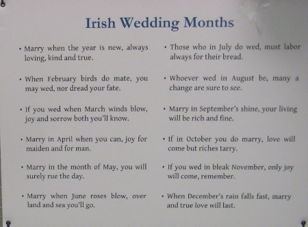There were a bunch more Irish wedding traditions on another sign, the most interesting of which was called Handfasting. I can think of a few jokes, none of which have anything in the world to do with actual Irish handfasting. There seems to be some debate about it, but it was basically a trial period before a “real” marriage with no legalities involved. This was probably before dating – and Tweeting and FaceTiming as we know it today though. NOW we do it the right way.