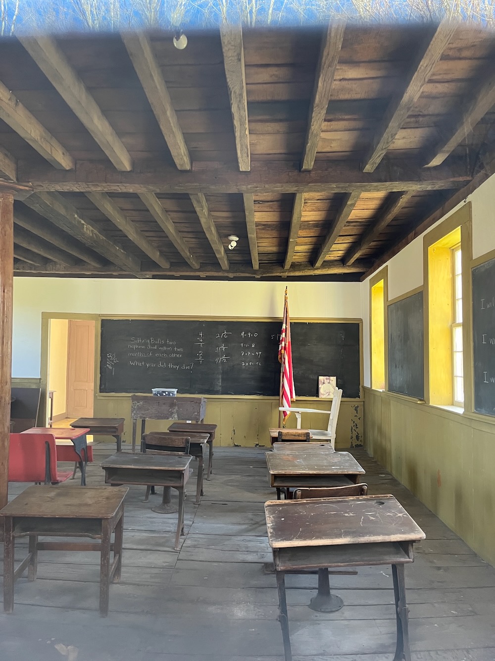 It’s got all the usual things; the old desks and slate board and… that’s pretty much it. I don’t see a pot belly stove! I assume some of the usual text books and teacher pay scale sheet are put away for protection for the 364 days per year the building is locked up.