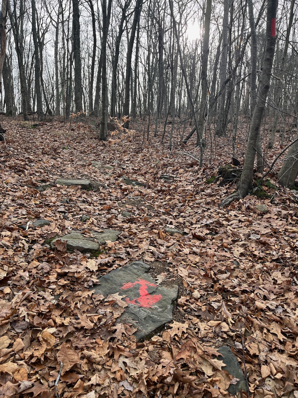 I walked the big loop clockwise, which took me straight down the old road at first. These woods are legally huntable and since I was there on a Friday morning… I wore my blaze orange. Ten minutes down the red-blazed trail I noticed a hunter off in the woods and gave him a friendly wave. He waved back. As the trail began climbing a bit, I passed the old cabin and came to an intersection shortly thereafter.