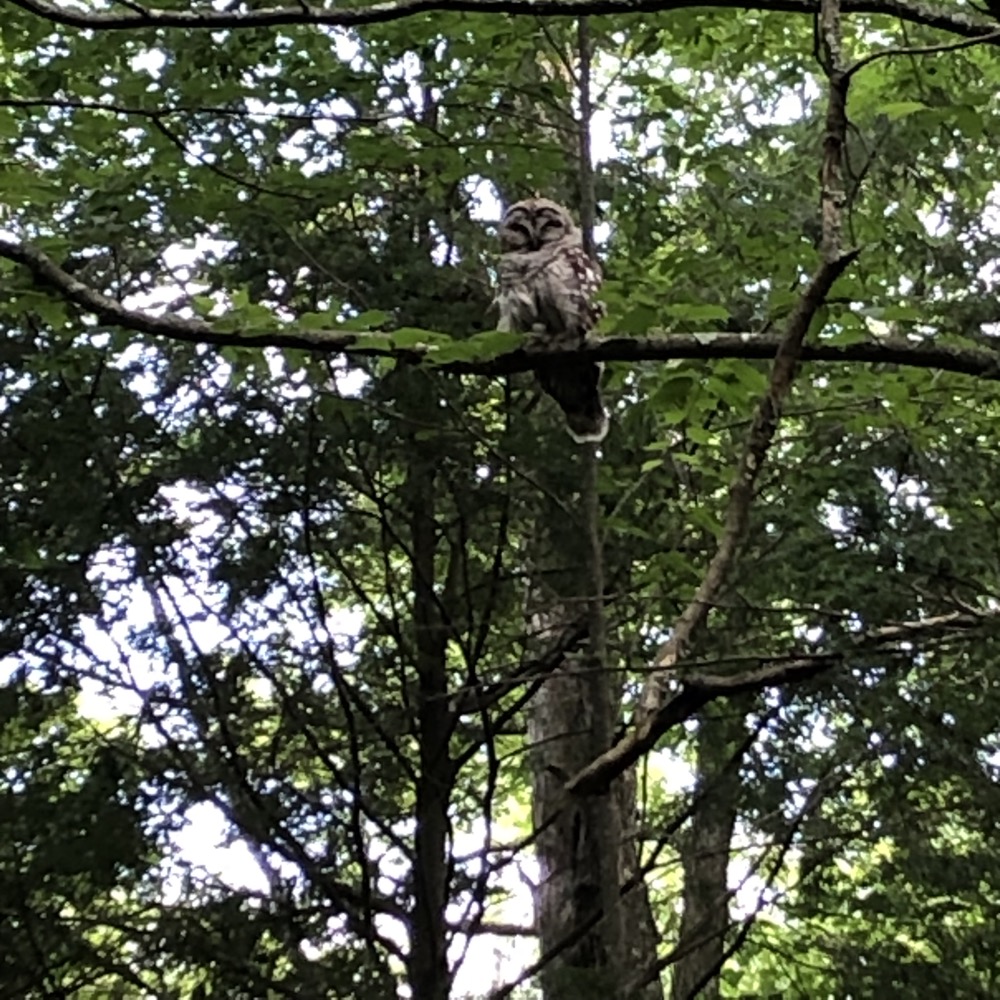 I had never seen purple mushrooms before. Neato… continued up the steep part, past the viewpoint, though the cool mossy and rocky areas, back across the woods road, and hey! The owl was still there! He had changed trees and didn’t allow me to get as close this time. Perhaps I looked more threatening now that I had climbed two steep hills.