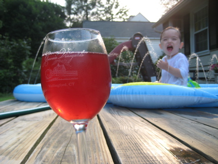 7. Rosedale Vineyards (Simsbury) Glass on edge of deck with baby snapping turtle I found under the rose bush in the background: