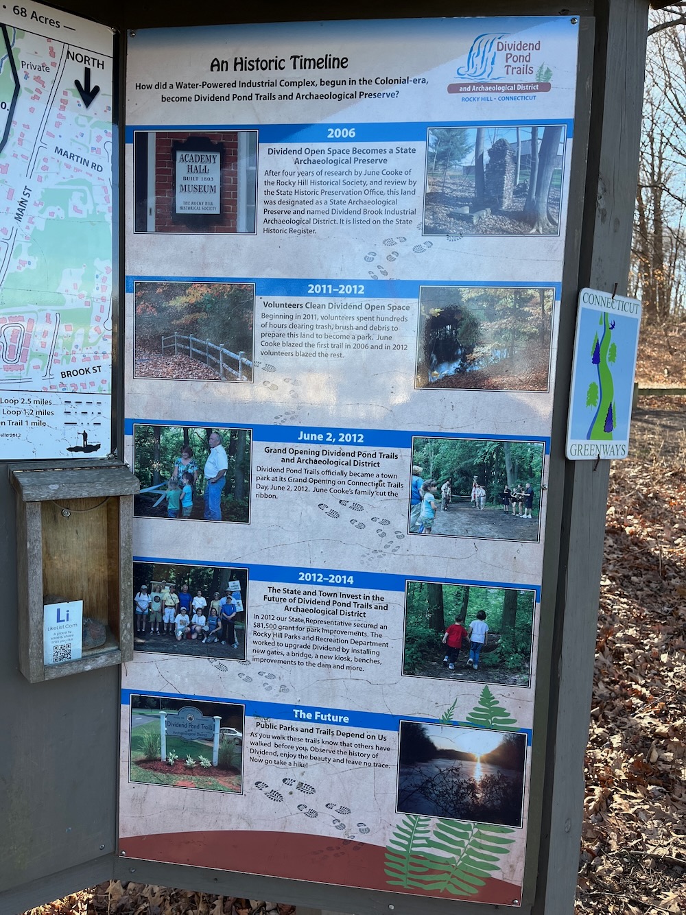 June passed away in 2015 and her out-and-back trail takes visitors past more mill sites and along the banks of the brook. I hope this link to her story still works when you click on it. There’s way too much to include here, but I wanted to let you know that Ms. Cooke was interested in archaeology since she was a little girl. She spent her life with various archaeological societies and organizations, both exploring and preserving sites. She helped establish legislation to preserve and protect important areas around Connecticut.