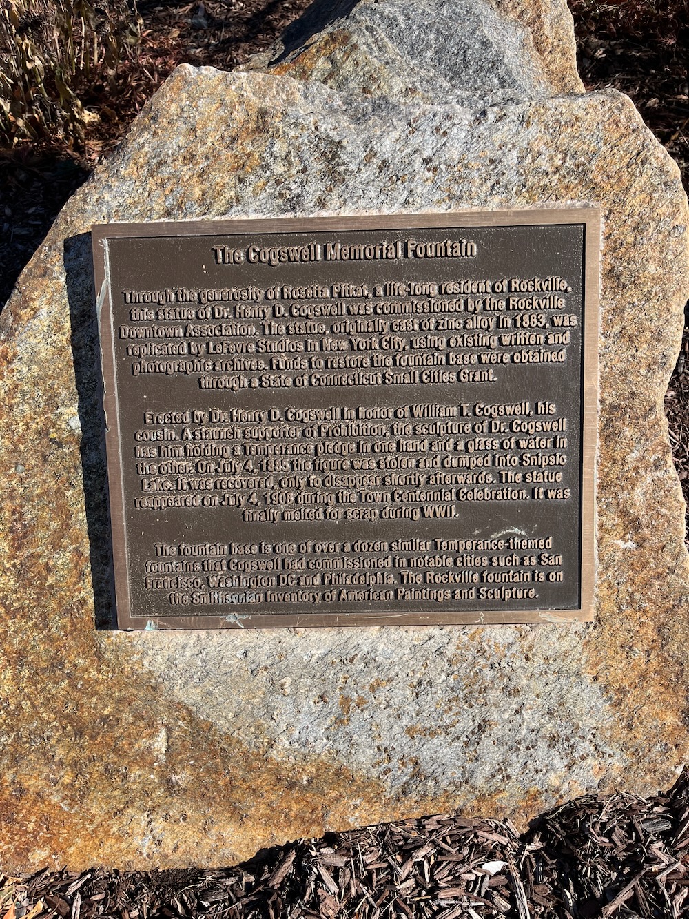 In all, Dr. Cogswell was able to erect 31 of these odes to himself – and temperance… and fetid water… around the country. Most were in big cities, but Rockville got so lucky because Dr. Cogswell’s cousin lived there.