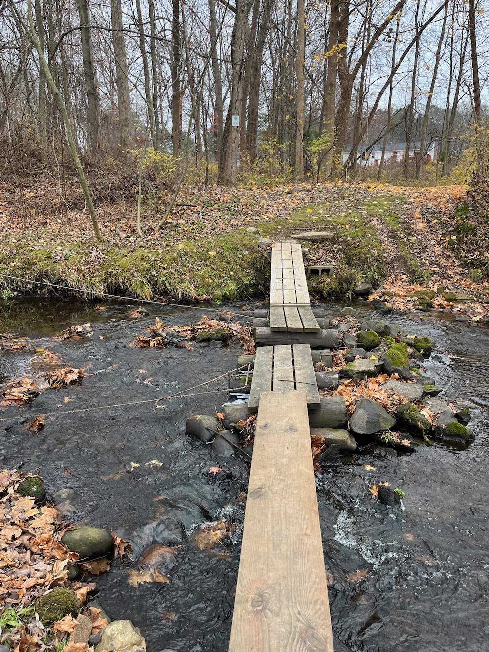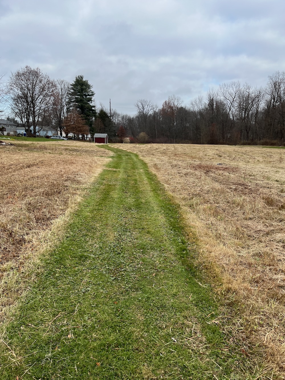 The trail starts in a mowed field and the paths are very clear as you can see in my pictures. I found my way to the back of the field, across a bridge, and into the woods. The trail courses south and does its absolute best to be “woodsy” and I’m sure it’s more hidden from the houses in the summer. But let’s be honest, this isn’t the best trail around.