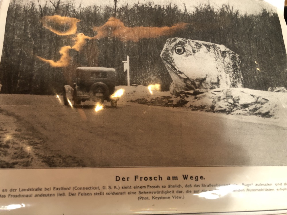 August 17, 2013 at 2:12 amI lived most of my life in Norton MA but my father was from Waterbury CT and we took many trips each year to visit relatives in CT. In the early 50’s, we took a route which took us by a rock that was sticking out into the road. A frog’s face was painted on both sides of the rock and it was signed with two names. I think the names were Buster and Sally. In 1956, my father was told of a different way to Waterbury and as we were driving along we spotted a white sign saying, Frog Rock just ahead. Next we saw a sign saying Frog Rock entrance and we saw the big ole frog. On other trips to Waterbury, my mother made sandwiches and we stopped at Frog Rock.I will continue more at another date cause I have a lot more to tell.