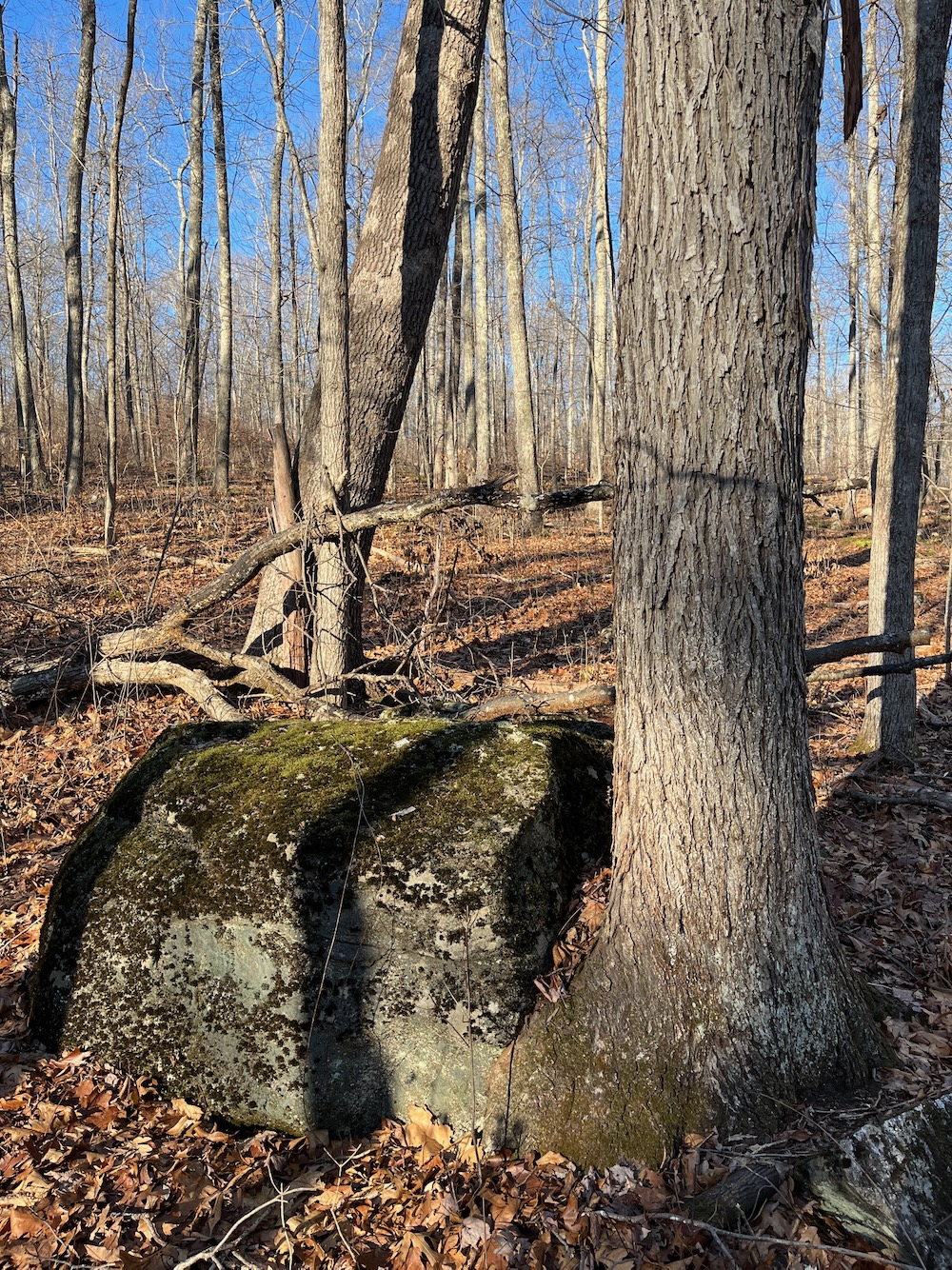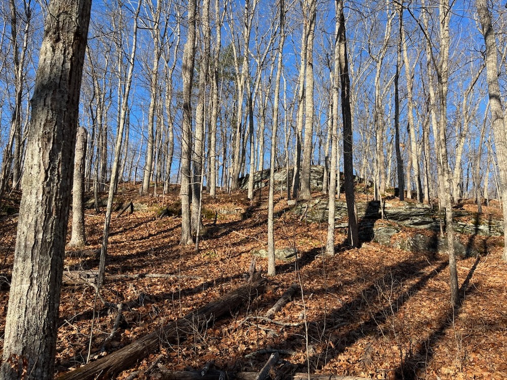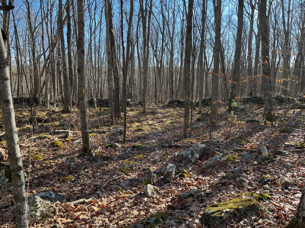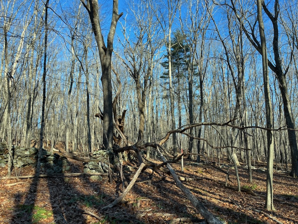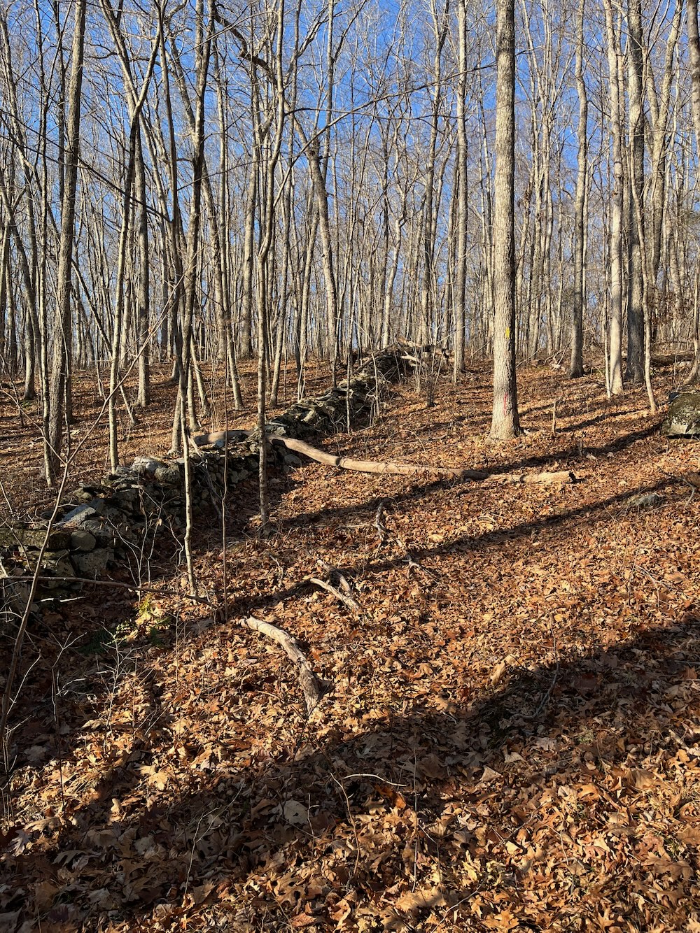 To the west of the wetlands, land rises steeply to exposed bedrock ledges, and continues on a more gently slope through an oak-hickory forest with mature trees and a largely closed canopy. The stone walls that dot the forest provide clues to the land’s past life as a pasture, most likely used in colonial times and until World War II. Intermittent streams run from the forest in the west to the wetlands in the east.