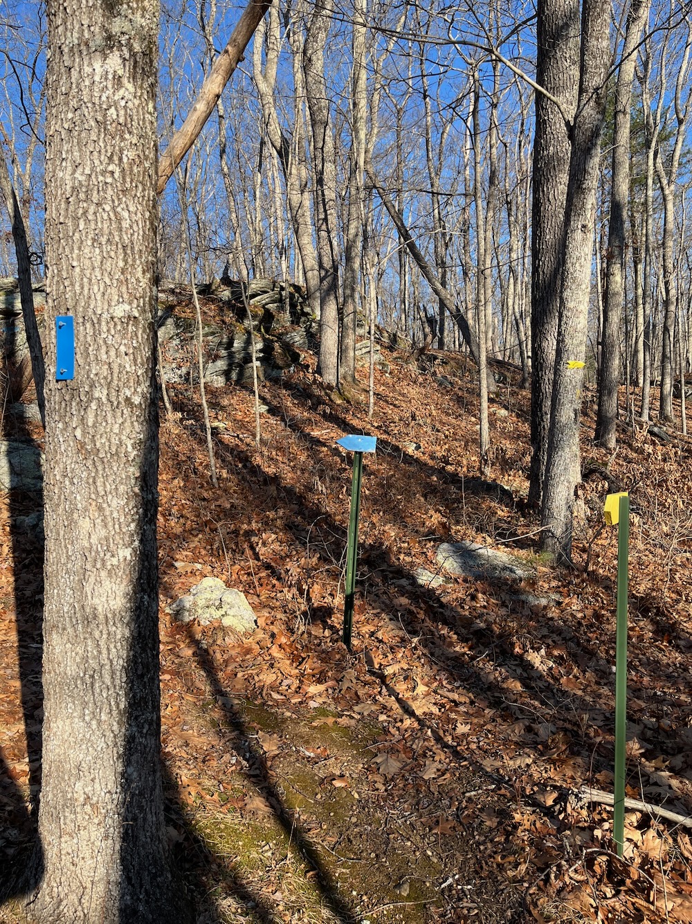 Somewhere around here is a connector trail to the town’s Tremko Trail, but I didn’t happen to see it. I reconnected with the yellow loop and continued my walk around the property. This final third that took me back down to the gravel ponds did feature a lot of incredibly well-built stone walls.