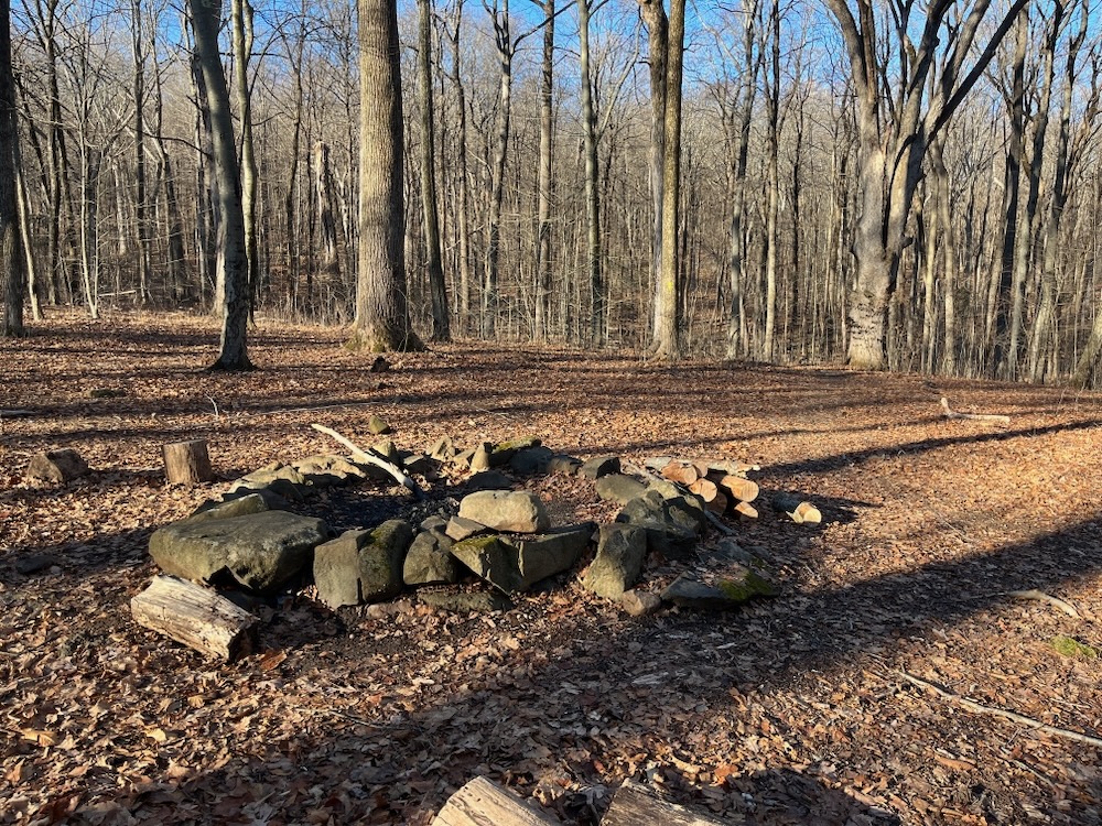 Past the dog park, the trail begins to climb Beseck Mountain. After maybe half a mile from the lot, I passed a cleared flat area with a fire ring. I believe this was the area where a different scout 25 years ago proposed a sort of permanent campsite. The trail to here was cleared and well-traveled and it appears people use this fire ring fairly often.