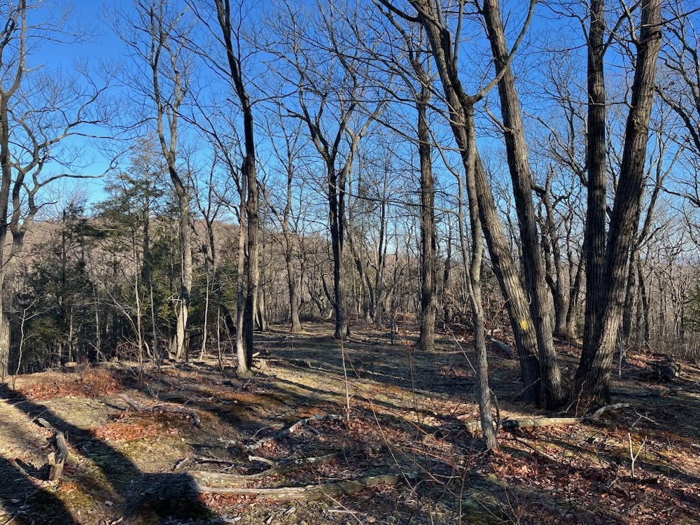 Continuing on, up the hill, the trail immediately becomes less clear. The blazes are still prominent enough, but no one is going through here with loppers and chainsaws more than once or twice a year.