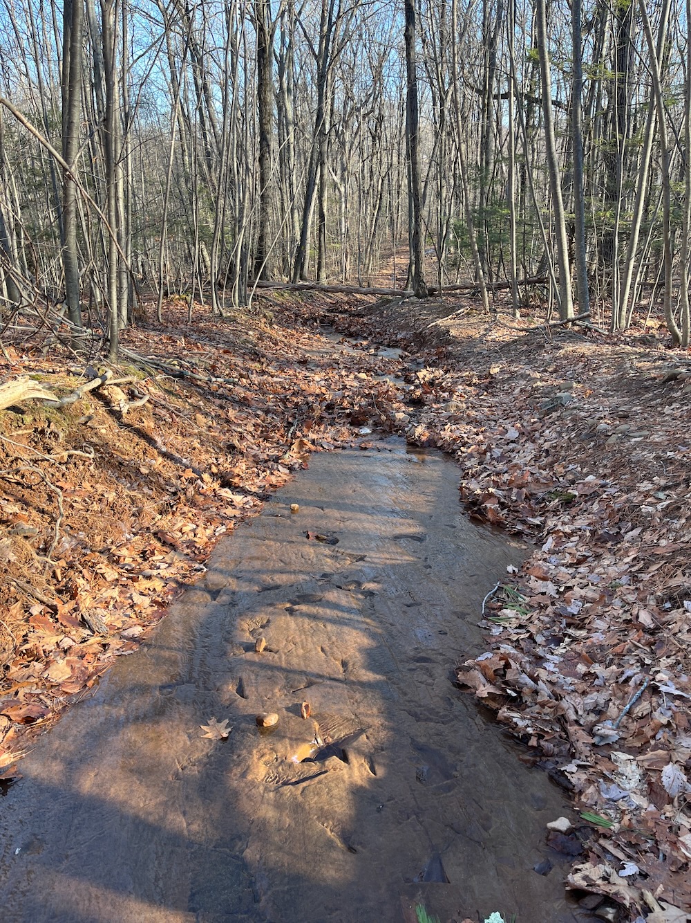 From there, the trail descends from the ridge down towards a Jeep trail and a brook that heads down to Beseck Lake. This “Jeep Trail” has seen better days and I would not encourage any Jeeping here. As for walking, this section of trail can be a bit of a mess as the trail is also a stream.