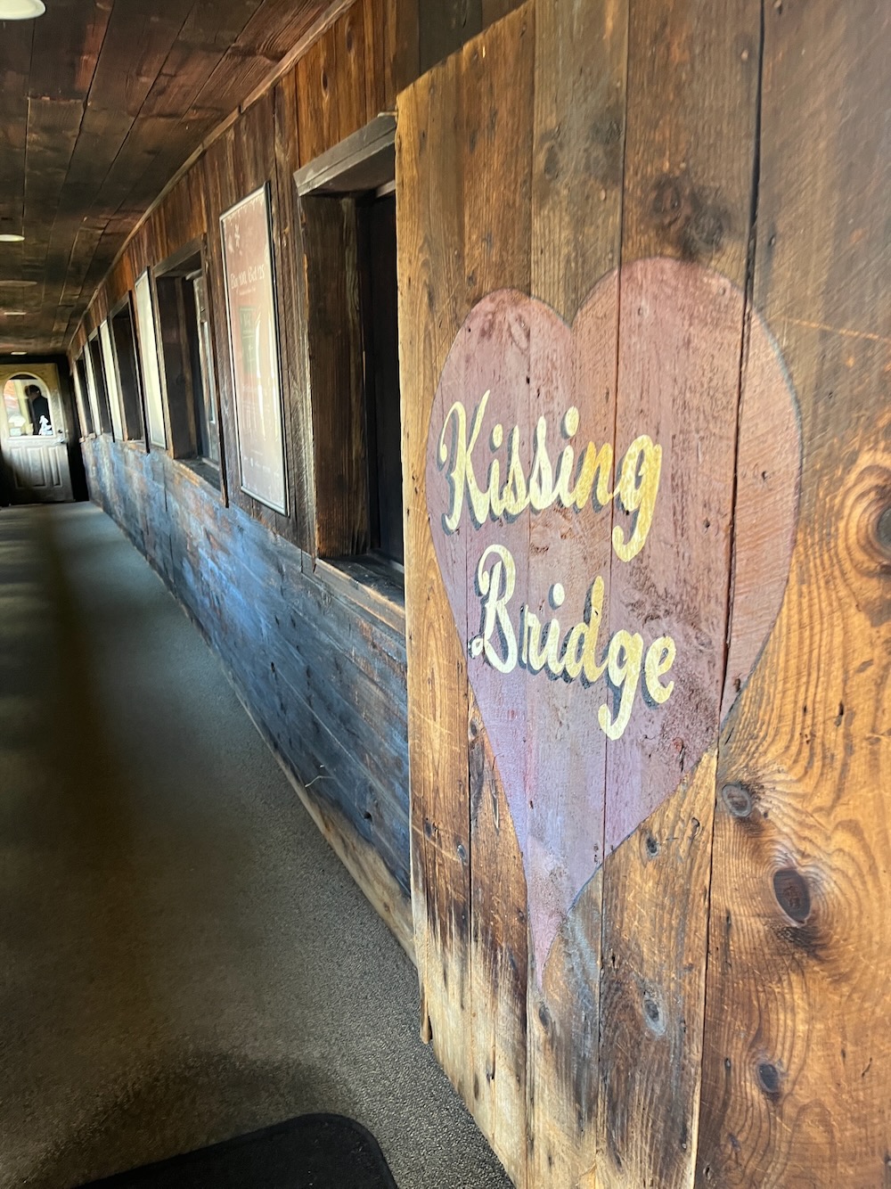 It’s an old tradition from the horse-and-buggy days, when a boy would stop halfway across a covered bridge where it was quiet to give his girl a kiss. Old-timers used to call all covered bridges “kissing bridges.”