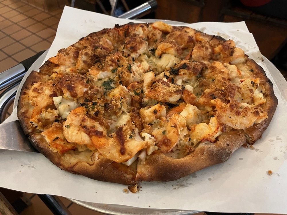 This is the most expensive pizza in the state (and surely beyond), but it’s easy to understand why. It comes loaded with lobster, shrimp, and scallops. The shrimp are large, the scallops are huge, and the lobster is tail meat. A bunch of garlic and oregano and butter is baked into this whole thing. It is glorious.