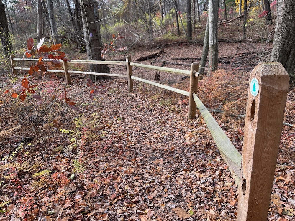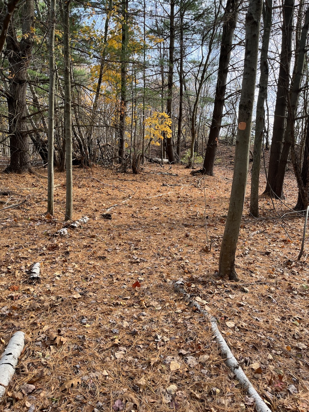 I would, however, encourage you to do the orange trail, which heads south from the main farm road shortly after beginning at the hiker lot. It rapidly ascends a little hill through a pine grove before crossing another dirt road and beginning a loop. Find this loop.