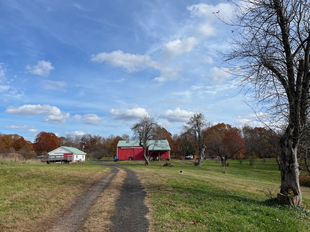 This is New England in miniature. An old farm, fading fall foliage, and white clouds wisping in a blue sky.