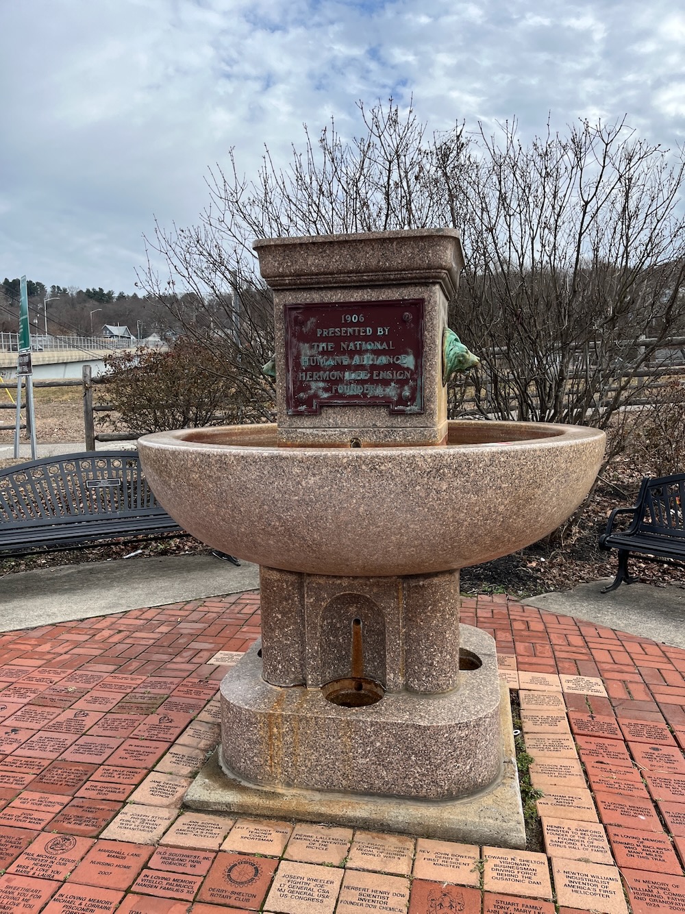 The National Humane Alliance fountains are a series of granite drinking fountains that were intended to provide fresh drinking water for horses, dogs, cats, and people. About 125 of the fountains were donated to cities throughout the United States and Mexico between 1902 and 1915. Most of the fountains have been removed from their original sites, usually in the center of busy intersections, but at least 70 of them are still publicly viewable. Derby’s is quite nice.