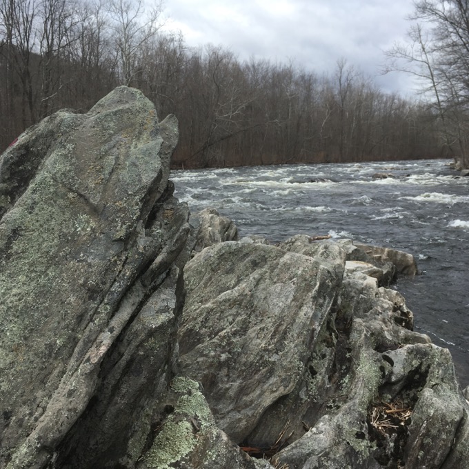 We finally made it back to the site of the first power dams at the rocky shore of the river. Suddenly, the “boring hike” became not at all boring. This is Calvin’s playground. The sudden and surprisingly rugged little outcropping is both beautiful and dangerous. They poke out over the river’s rapids omninously; offering a stark contrast to the bucolic suburban framework that is Unionville and greater Farmington.