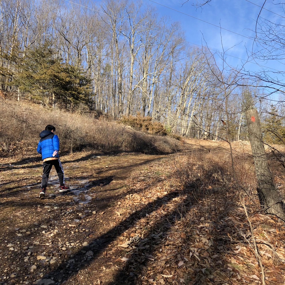 Once through the woods near the parking lot, we really got huffing and puffing. But not on the red trail. I forced my poor child to climb the steep hill of the abandoned ski slope. Just because it’s cool. The tow house still stands and man, this was a pretty steep drop for high school skiers in the 1960’s. (The Westledge School built it, the Masters School let it rot, but somehow it’s still very easily discernable.)