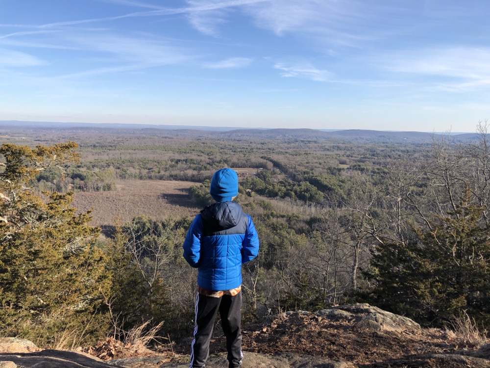And we did enjoy the views along the ridge here. It’s cool now that Calvin can recognize a few Farmington Valley landmarks when I direct his gaze. I love it up here, but it was mid-afternoon in late December and we’d be hiking a valley on the way back to the car and the sun sets fast.