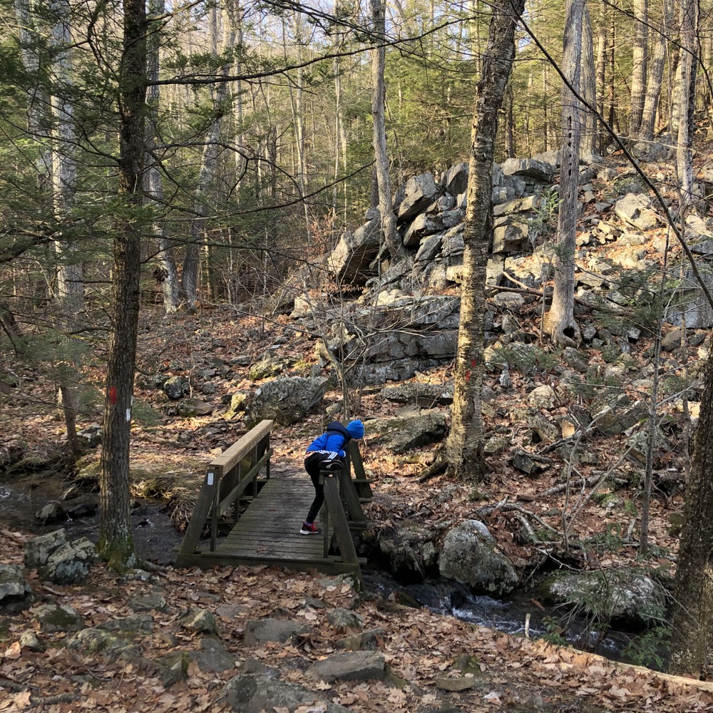 This first area nearest Westledge Road is actually a parcel called 60 Westledge Road. Very creative. There’s a little half-mile loop here. This offers a cute little walk for the preschool set I suppose. There are stone stairs and a bridge across Hop Brook. There’s even a picnic area along the red-blazed side of the loop.