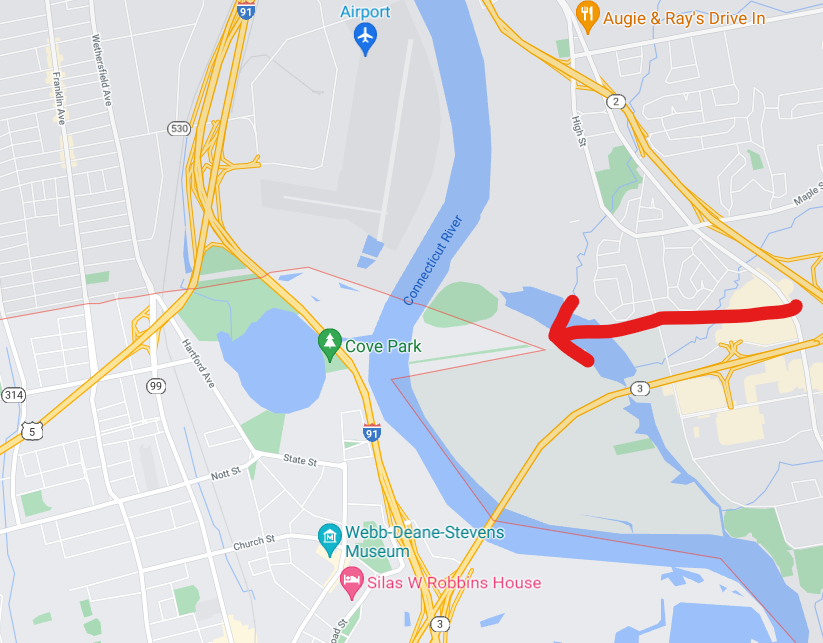 Someday you’ll be able to walk or bike from East Hartford’s Great River Park via the Charter Oak Greenway. Until that happens, the main entrance is accessed by taking East Hartford’s South Meadow Lane, off of High Street. South Meadow Lane starts off paved, then switches to single lane gravel, ending at the river.