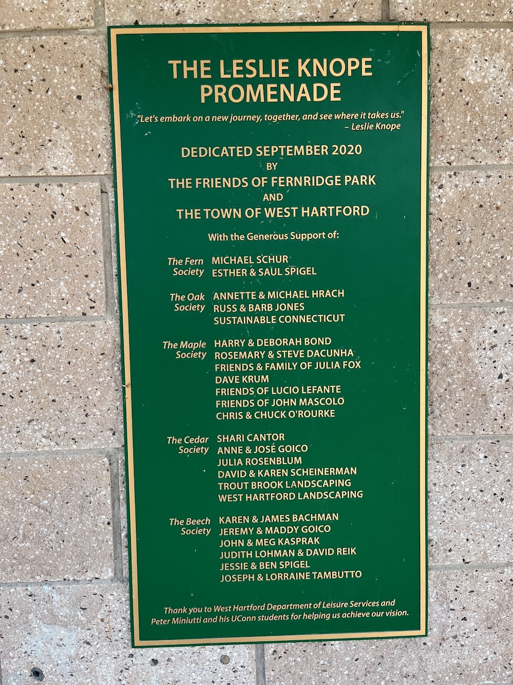 The plaque has a quote attributable to Knope: “Let’s embark on a new journey, together, and see where it takes us.” The Leslie Knope Promenade “is a key element of the park’s new design, a wide paved area that encircles the pool house in the center of the park, from which all of the spokes – the pathways – branch out through the park to neighborhood streets.”