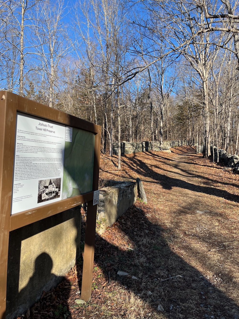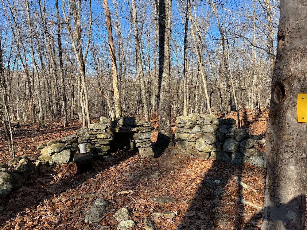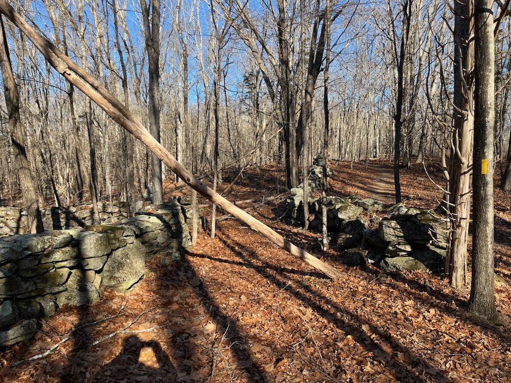At one point, for some reason, there’s a stone wall and a sort of hearth thing with some kitchen implements. This was pretty far from where the house would have stood, so I don’t really know why this is out here, but it’s interesting at least. I continued on my clockwise trip around Tower Hill and quickly reached the red spur trail.