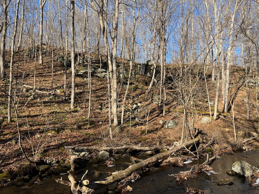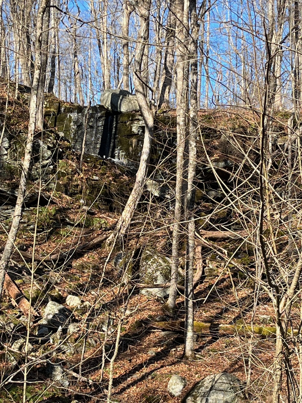 I followed the red trail down to Stonehouse Brook and it is a right lovely brook. I’d almost give it river status. I had passed a rusted old barrel stove but my attention was immediately diverted across the brook high up on a cliff.