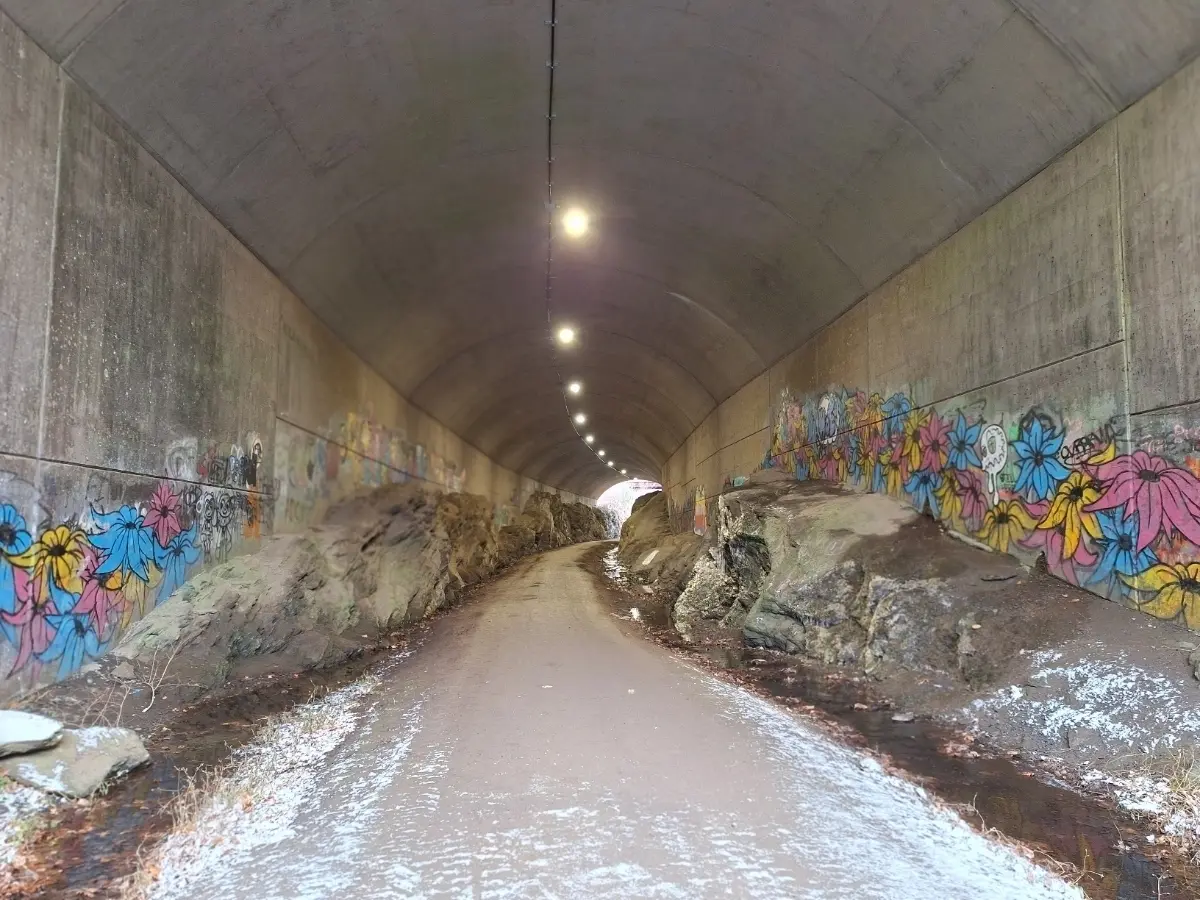 Speaking of which, this marked the first time I’ve taken Damian “hiking” in the snow. I put “hiking” in quote because, well, this challenge point isn’t exactly a Himalayan trek. The DEEP suggests TSTL’ers also take a ride along the Hop River State Park Trail, which follows an old rail bed through several towns.